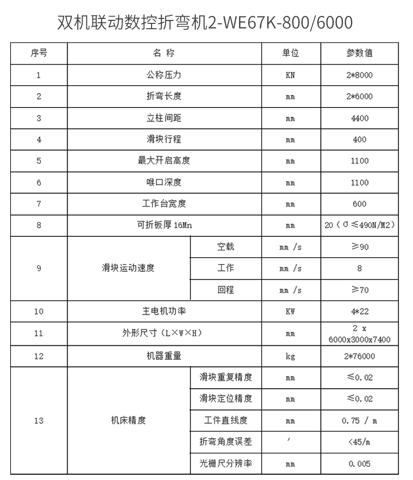 選用兩臺WE67K系列同規(guī)格主機(jī),配有雙機(jī)聯(lián)動同步裝置,可加工特長工件、精度高;兩臺機(jī)器亦可單獨(dú)使用,提高生產(chǎn)效率。下工作臺選配有自動液壓變形補(bǔ)償機(jī)構(gòu)或機(jī)械補(bǔ)償機(jī)構(gòu),可配用荷蘭Delem DA52、DA56、DA65W、DA69或瑞士Cybelec DNC84、DNC1200折彎機(jī)數(shù)控系統(tǒng)。